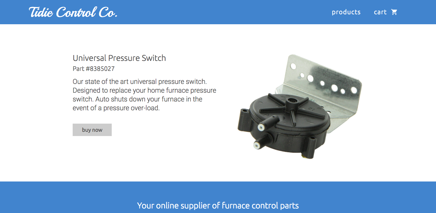 Tidie Control Company is a new and upcoming online supplier of furnace control parts. Upon release of their new Universal Pressure Switch they came to us looking for a quick and clean landing page to show it off. We designed and developed the user interface and basic Node.js web server.